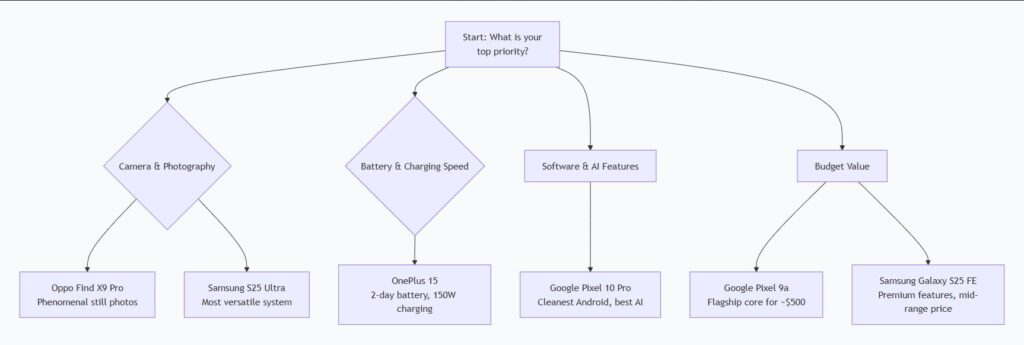 If you want the ultimate no-compromise experience: The iPhone 17 Pro Max and Samsung Galaxy S25 Ultra are the pinnacles of their respective platforms. Choose based on your ecosystem preference and whether you value the S-Pen.